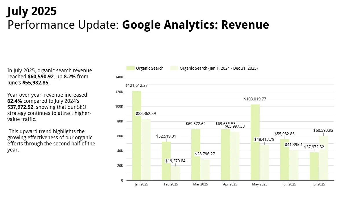 As you can see, we compare organic search revenue by month and year-over-year. We examine ROI trends and what these suggest for our clients.