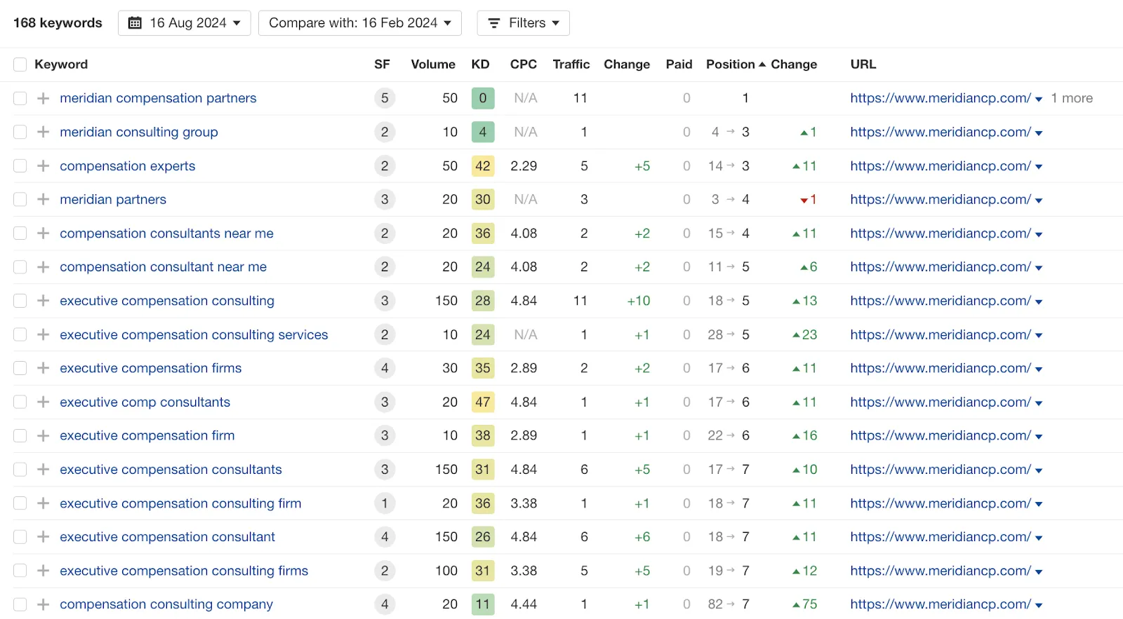Here are our results for Meridian Compensation Partners, for example, moving keywords from positions 20+ to among the first: