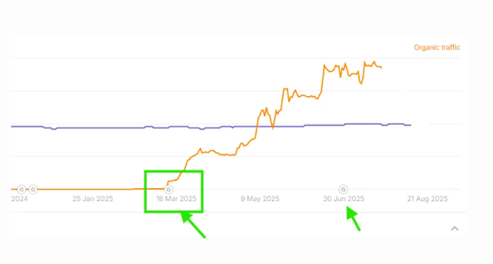 Last year, traffic on the site decreased significantly after the September 2024 Google update. We then improved our articles, and as such, the March Google update brought us an organic traffic increase that's still holding after the June Update.