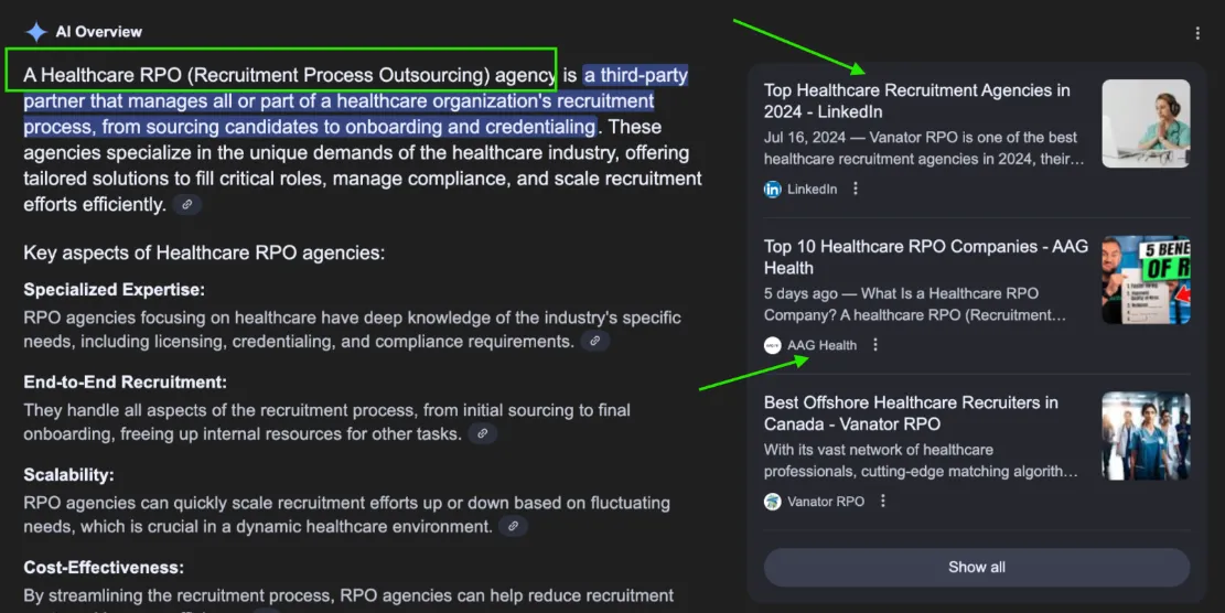 Our client, Alpha Apex Group Health, features a blog post titled Top 10 Healthcare RPO Companies. Its competitor has a similar article. And they republished it on LinkedIn. These have the greatest potential to be listed in AI Overviews, as seen below.