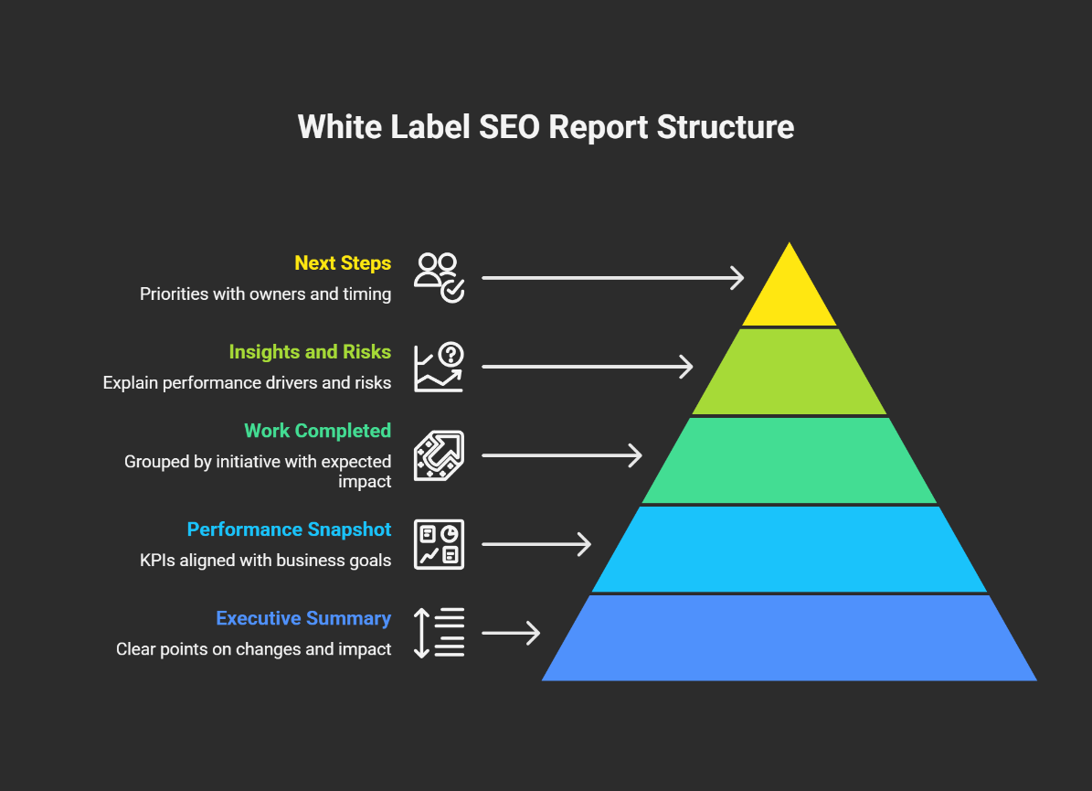 This comes from structure. Every white label SEO report should follow the same core sections, even if the details change by client.